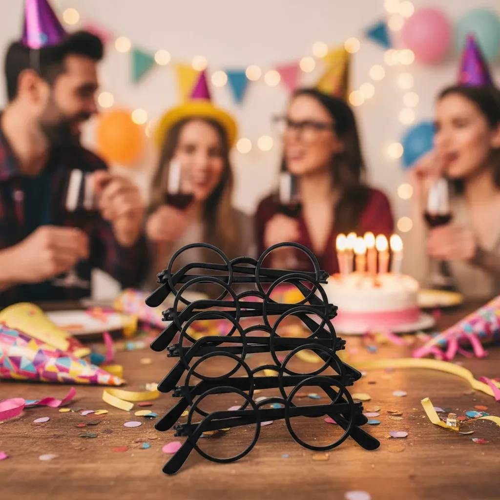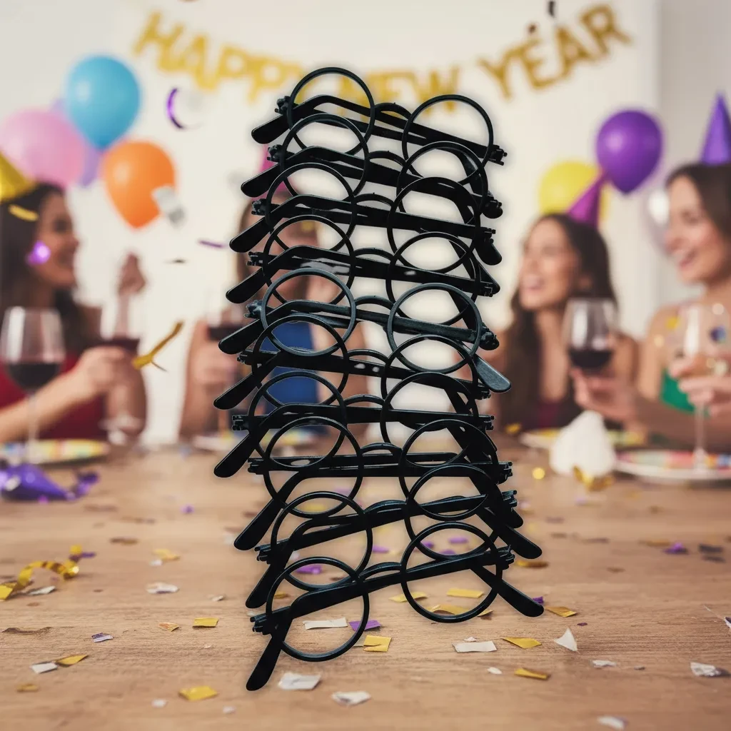 Feitos de resina plástica preta, cada óculos possui 15 cm de comprimento, garantindo conforto e estilo para todos os convidados.