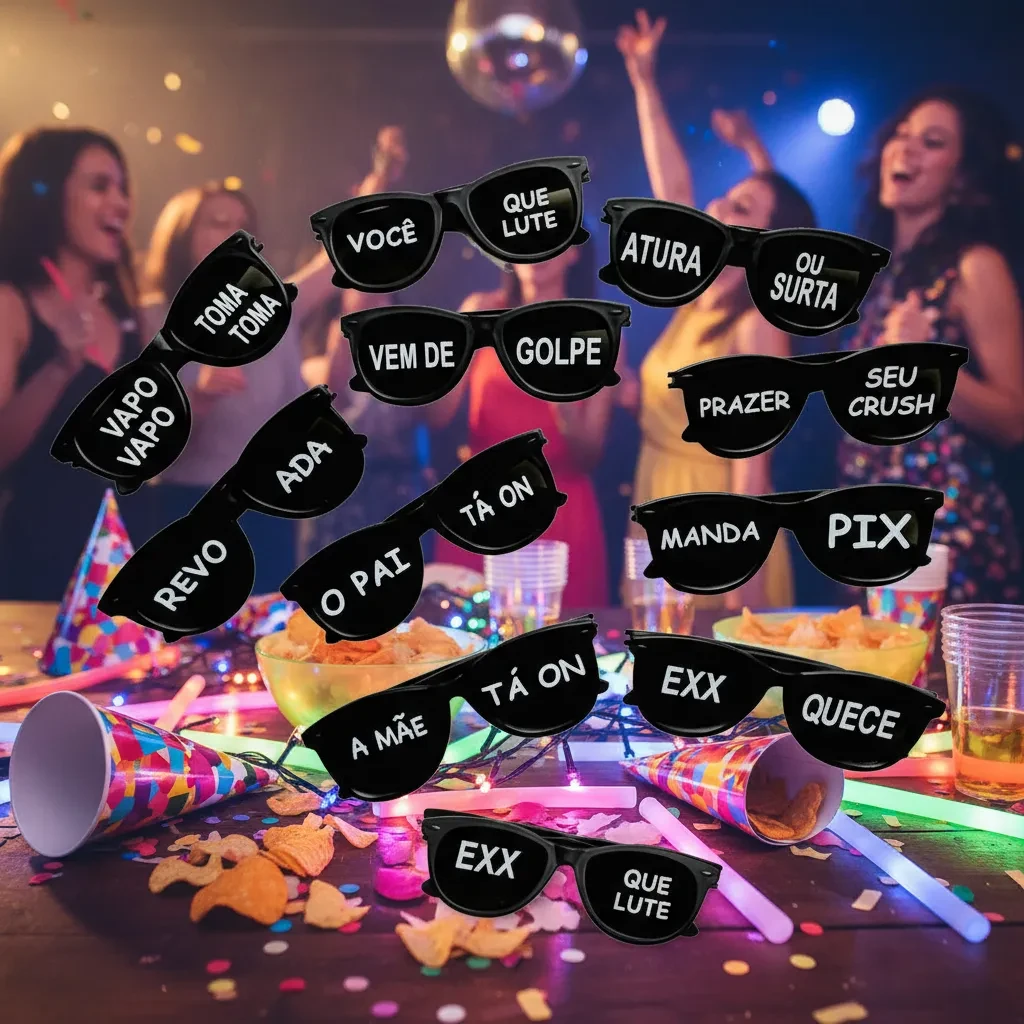 Adicione um charme único ao seu evento com nosso kit de 10 óculos retrô sortidos, cada um com uma frase divertida, perfeita para qualquer celebração. Os óculos possuem proteção UV400, garantindo segurança e estilo.