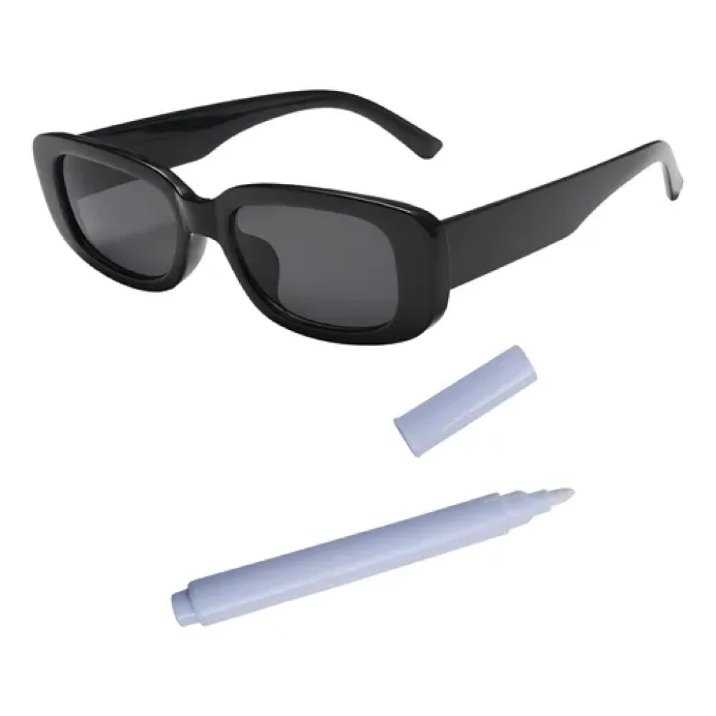 Embora não realizemos personalizações, os óculos permitem a aplicação de adesivos nas lentes e hastes. Além disso, cada kit acompanha uma caneta giz líquido, que possibilita a personalização manual.