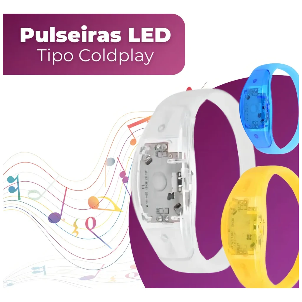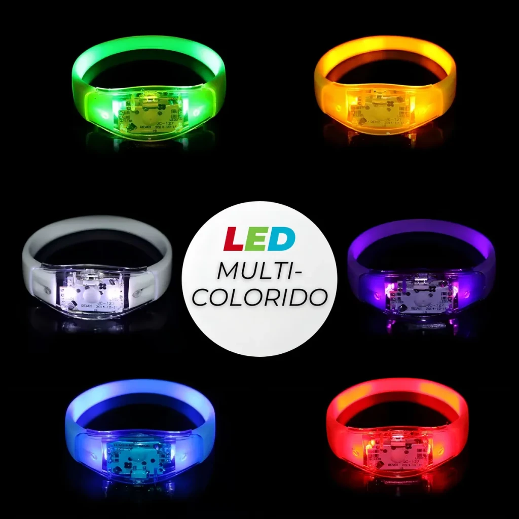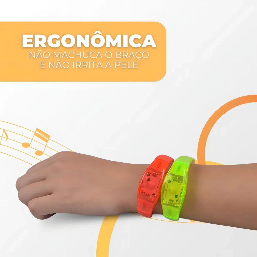 Transforme sua festa em um espetáculo de luz com as Pulseiras de LED que piscam conforme a batida da música. Feitas em silicone e plástico, são leves e ajustáveis para todas as idades.