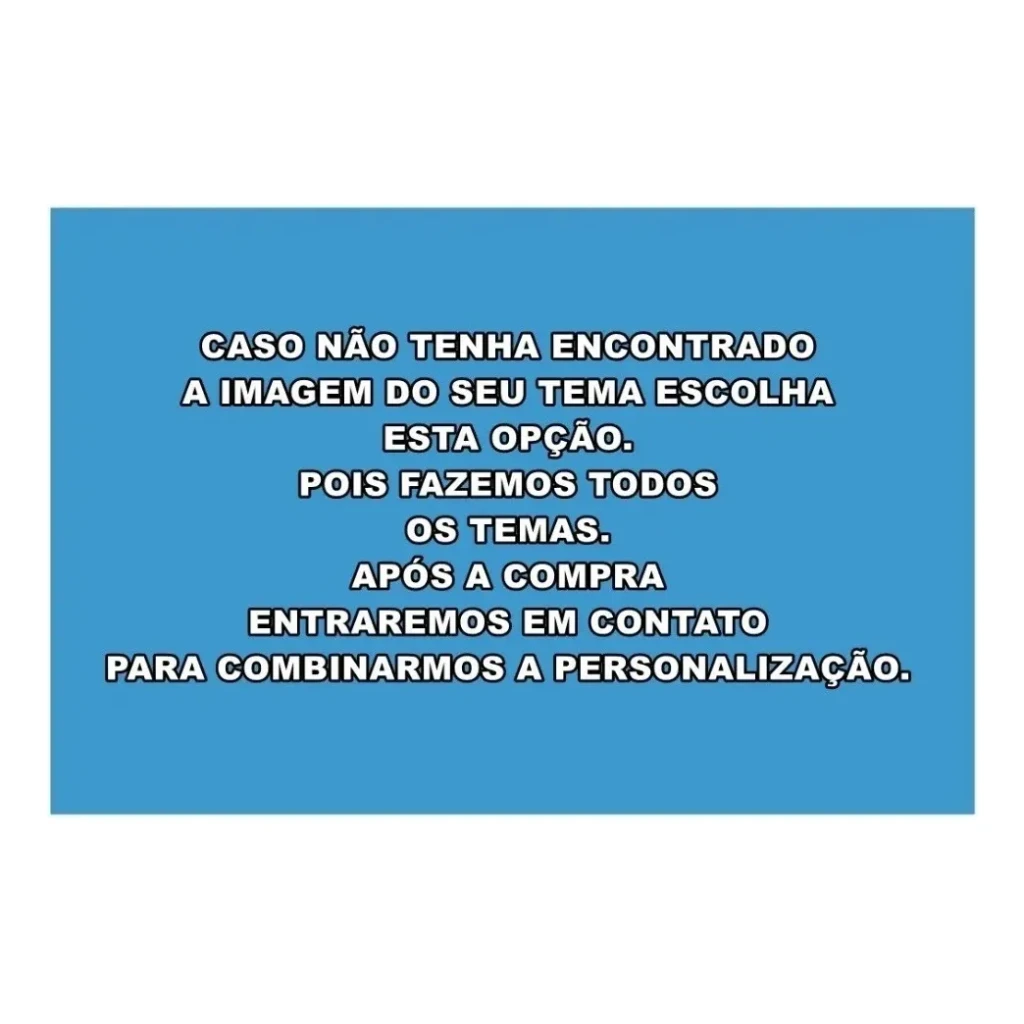 Realizamos personalizações em diversos temas. Caso não encontre o tema desejado, basta escolher um dos disponíveis e entraremos em contato para definir os detalhes.