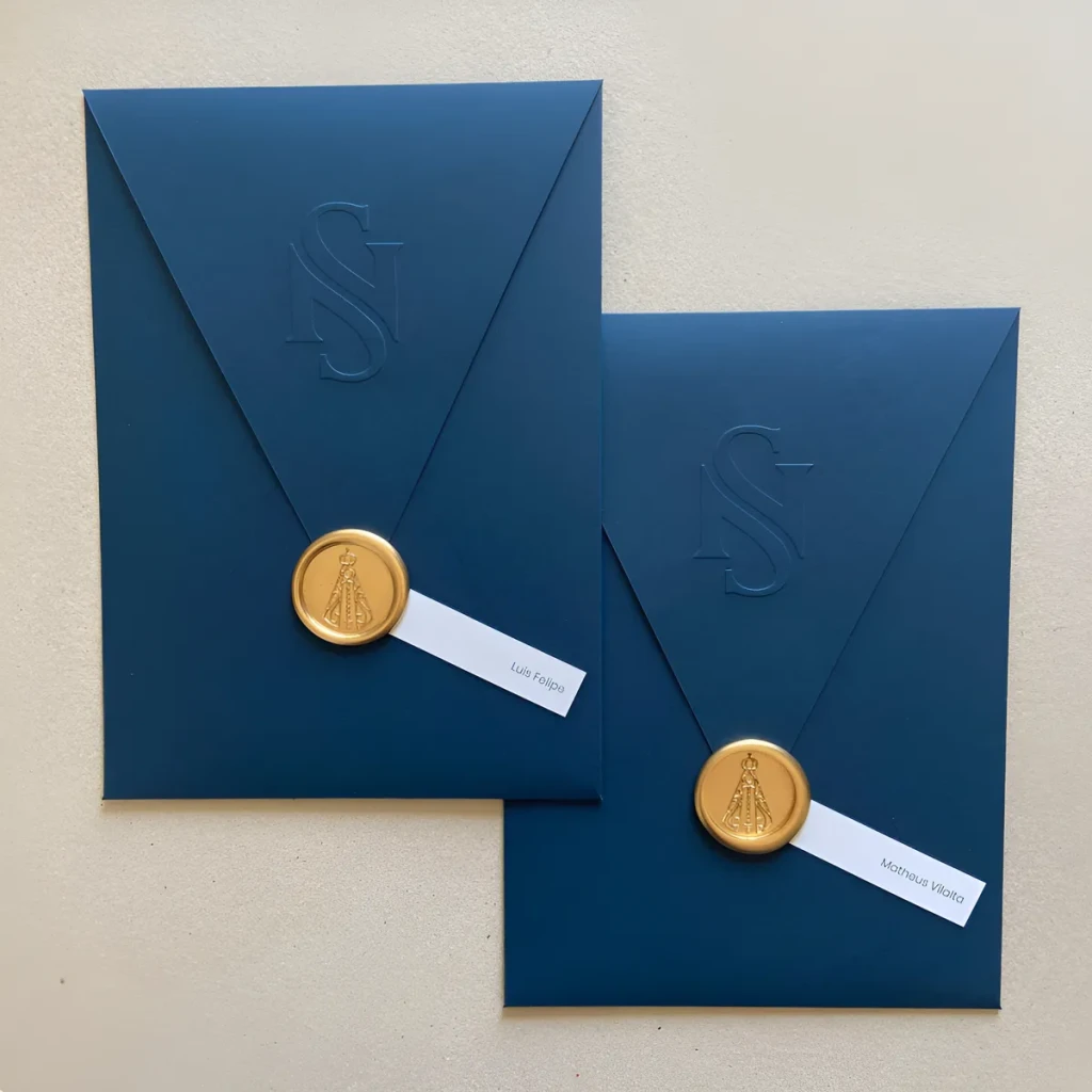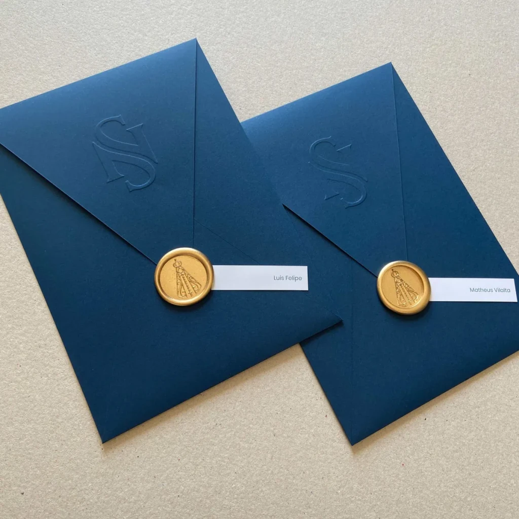 Os envelopes possuem detalhe em relevo com as iniciais na aba e lacres de cera, disponíveis em diversas cores da paleta. Ideal para convites especiais!