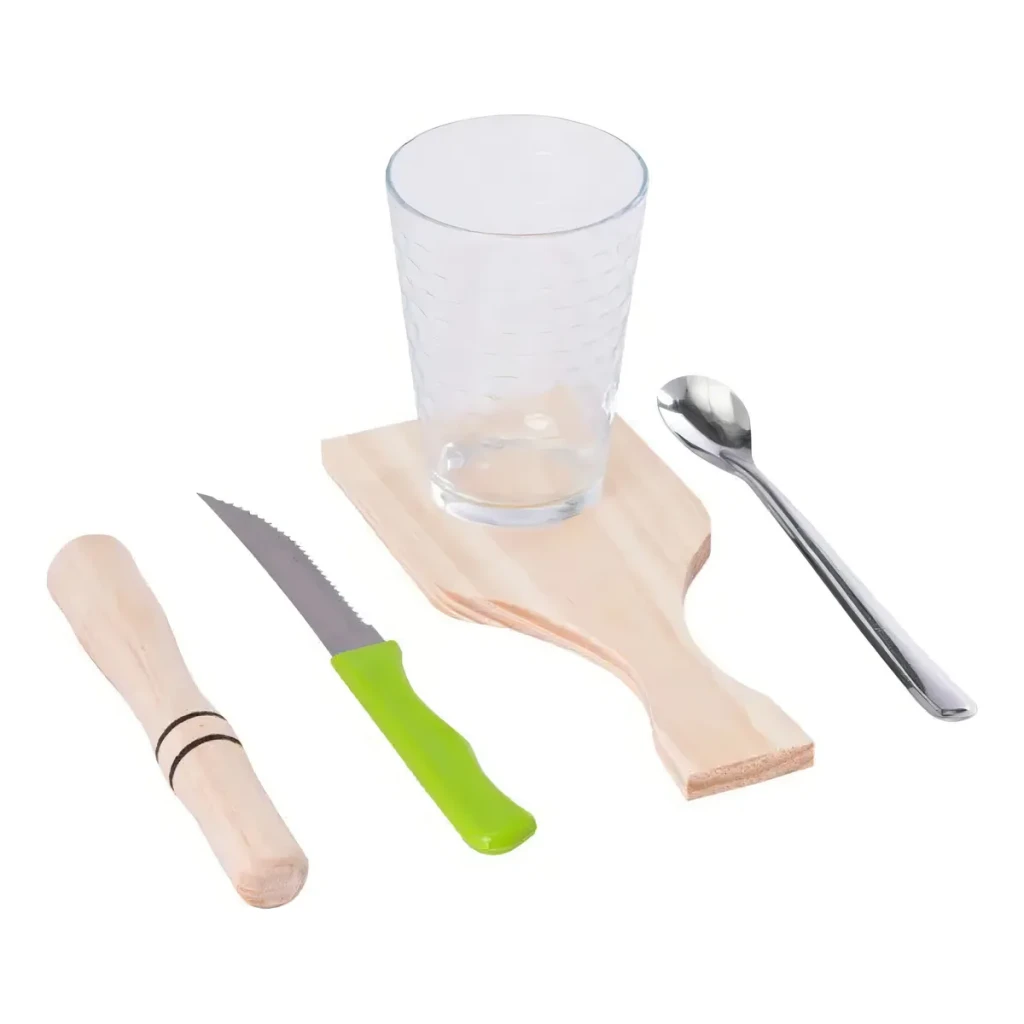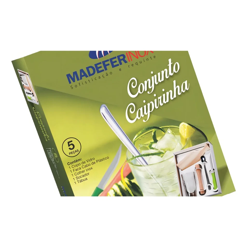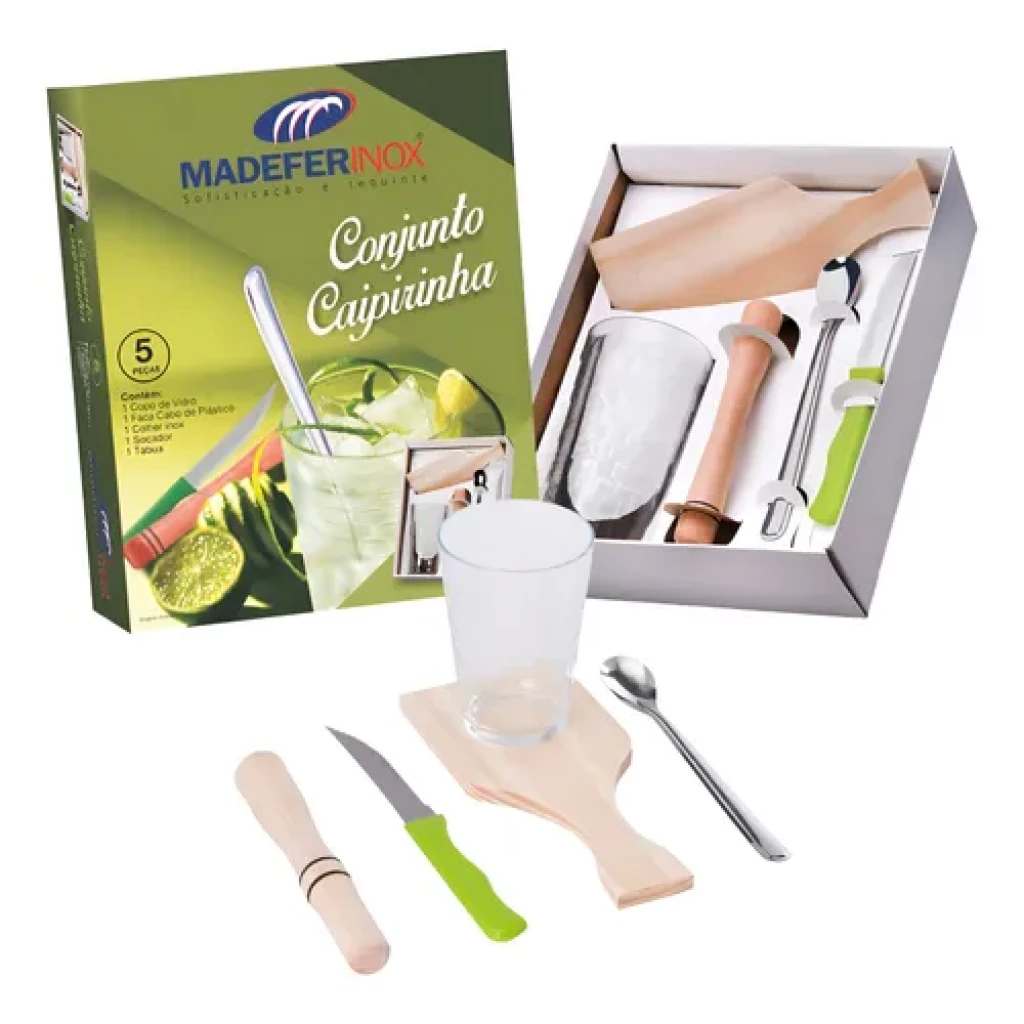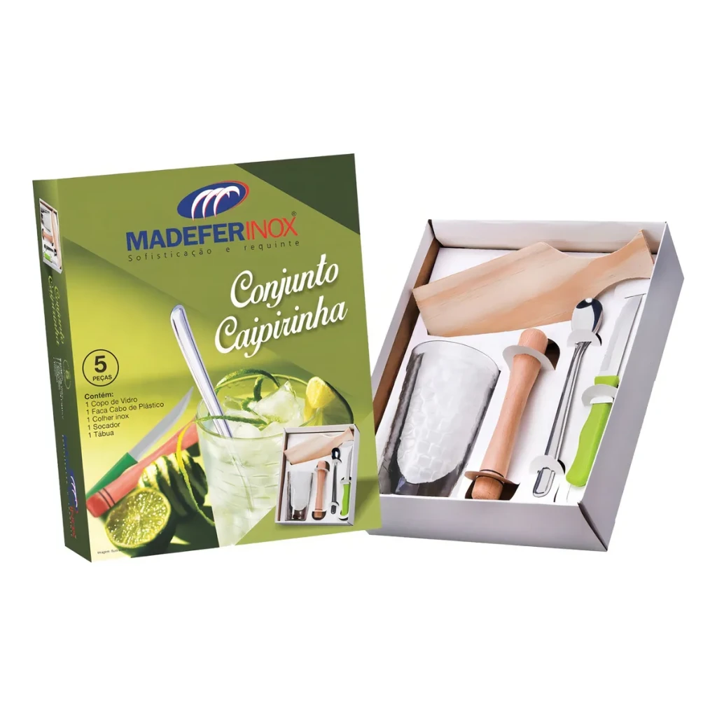 O Conjunto Caipirinha Completo da Madefer é a escolha ideal para os amantes dessa bebida clássica. Composto por cinco peças, ele inclui um copo de vidro de alta qualidade, uma faca com cabo de plástico resistente, uma colher de inox, um socador e uma tábua prática, oferecendo tudo que você precisa para criar a caipirinha perfeita.