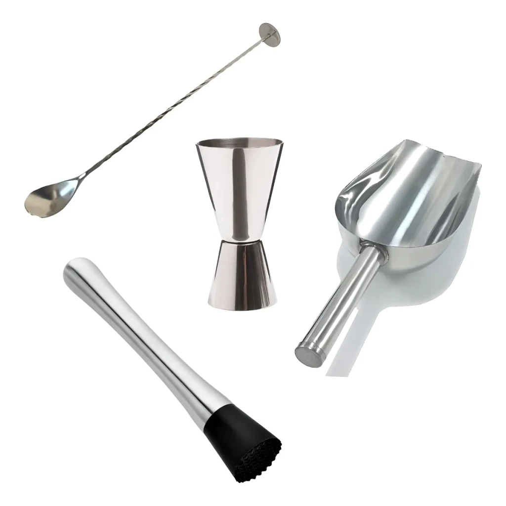 Fabricado em aço inoxidável durável, este kit é ideal para bares, festas e uso doméstico, combinando elegância e funcionalidade para a arte da mixologia.