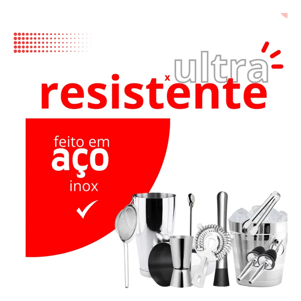 Ideal para bartenders profissionais e entusiastas, este conjunto inclui coqueteleira Boston, dosadores, peneiras e muito mais, garantindo praticidade e eficiência na sua estação de trabalho.