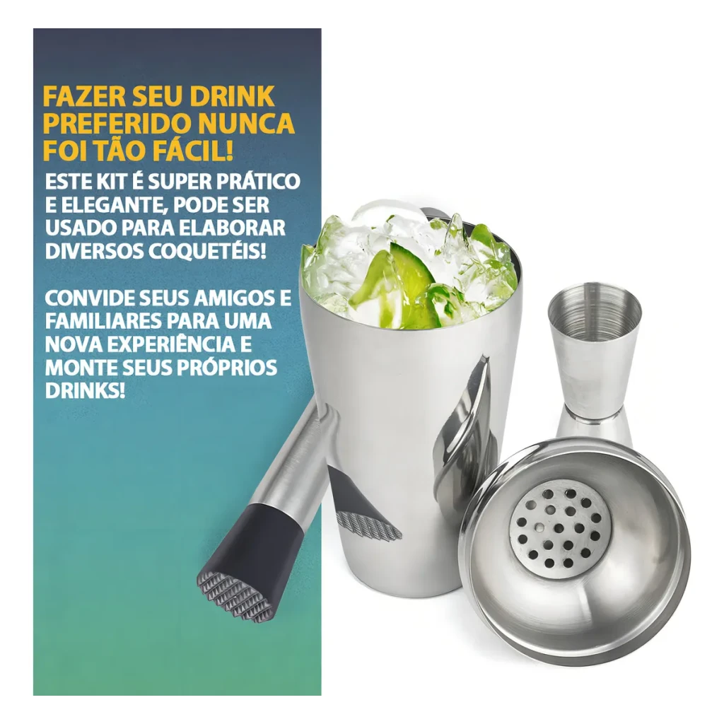 Kit Completo para Caipirinha: Coqueteleira, Socador e Dosador