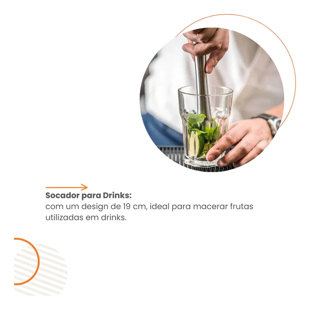 - Socador: 20,5 cm, perfeito para macerar frutas e ervas.