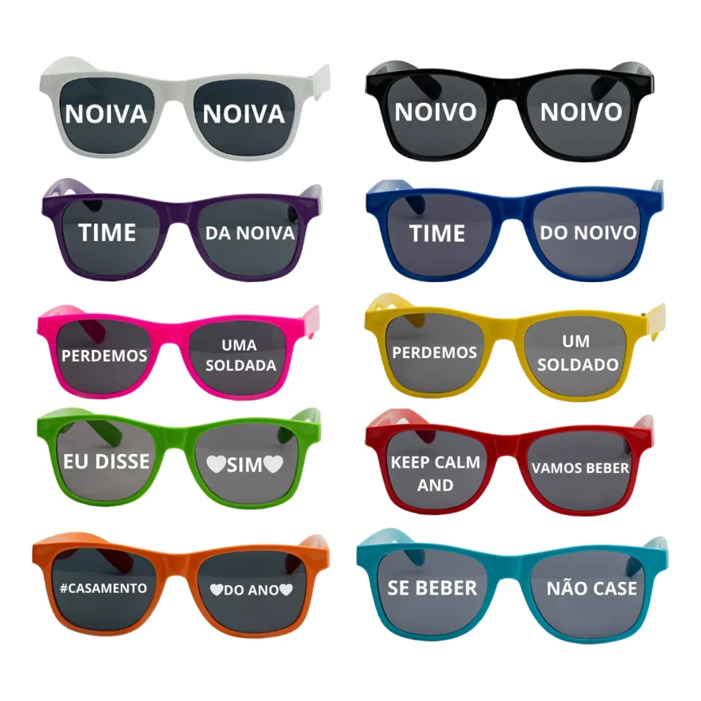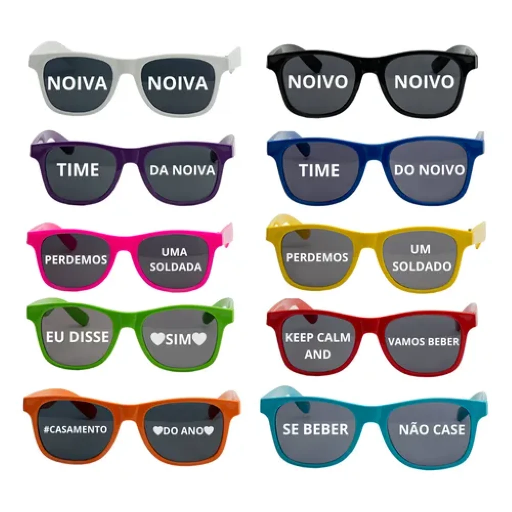 O nosso Kit de 10 Óculos Personalizados para Noiva e Noivo é a escolha perfeita para tornar seu casamento ainda mais especial. Cada óculos apresenta uma frase divertida, ideal para fotos e momentos descontraídos.