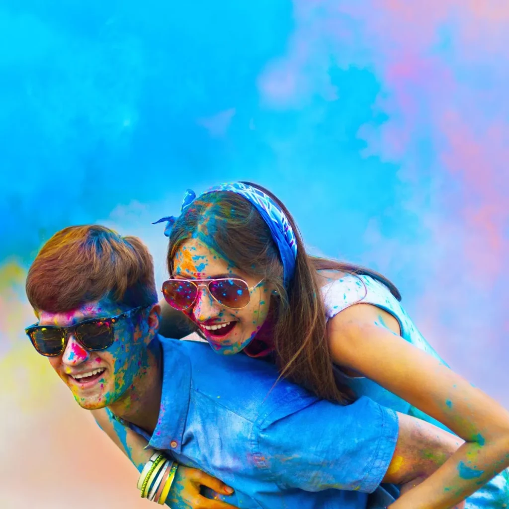 Distribua os saquinhos entre os convidados e sugira que usem roupas brancas ou claras. Faça uma contagem regressiva e joguem o pó para cima, criando uma nuvem colorida!