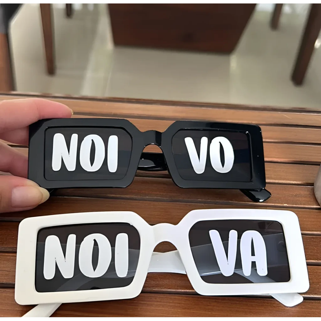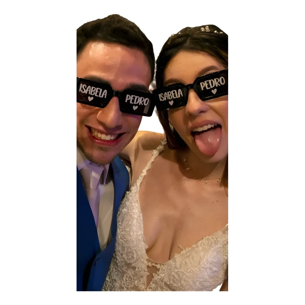 O Kit de Óculos Europeu é a escolha perfeita para noivos que desejam adicionar um toque especial ao seu grande dia. Com um design quadrado moderno, cada par é personalizado com os nomes dos noivos, tornando-o uma lembrança única.