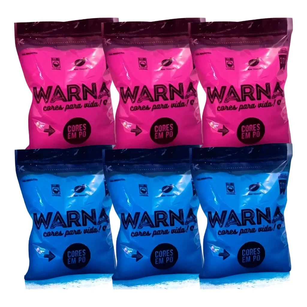 Descubra a alegria das revelações de gênero com o nosso kit de tintas em pó Warna, que inclui 3 unidades azuis e 3 unidades rosas. Cada pacote contém 100g de cor vibrante e fácil de usar.