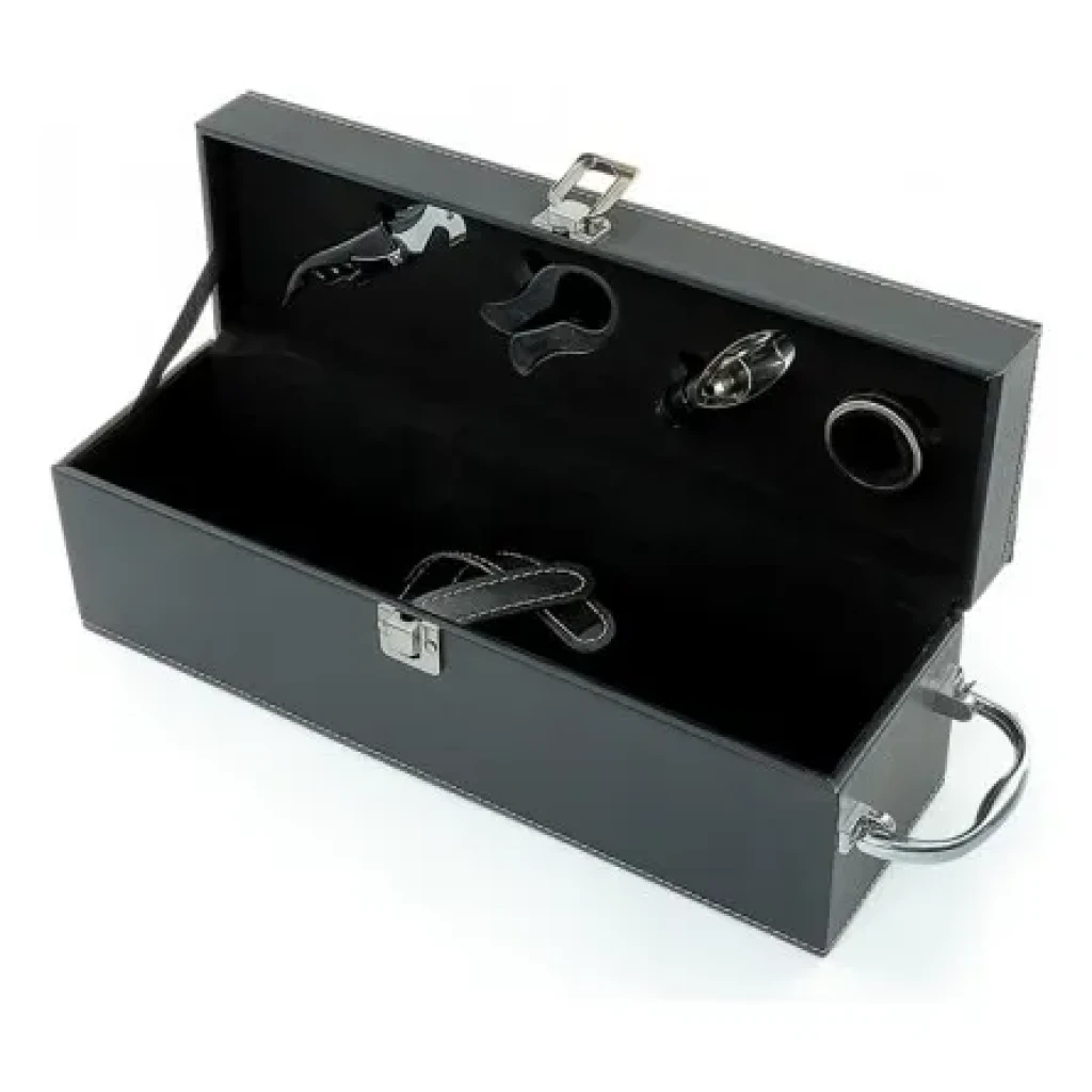 Inclui saca-rolhas metálico, bico condutor com tampa, cortador de lacre e wine colar. Perfeito para presentear ou aprimorar sua coleção pessoal.