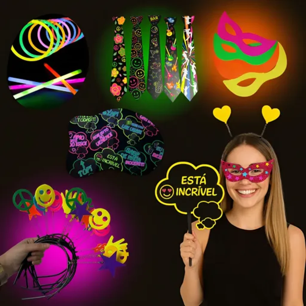 Com óculos, pulseiras e tiaras que brilham na escuridão, este kit é ideal para qualquer celebração, garantindo diversão para todas as idades.