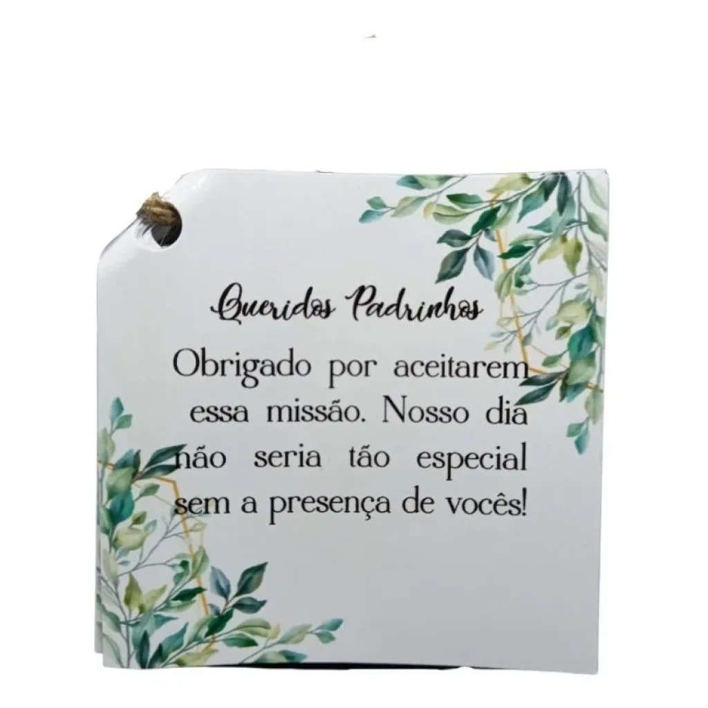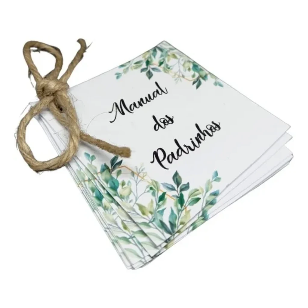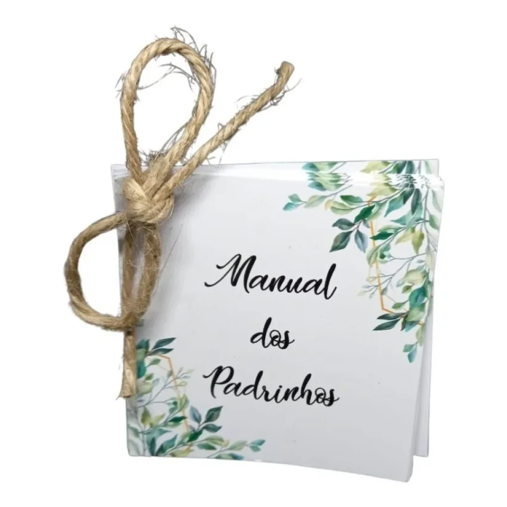 Ideal para surpreender seus padrinhos, o manual é finalizado com corte a laser e pode ser personalizado com cores e textos de sua escolha. Uma forma especial de mostrar sua gratidão!