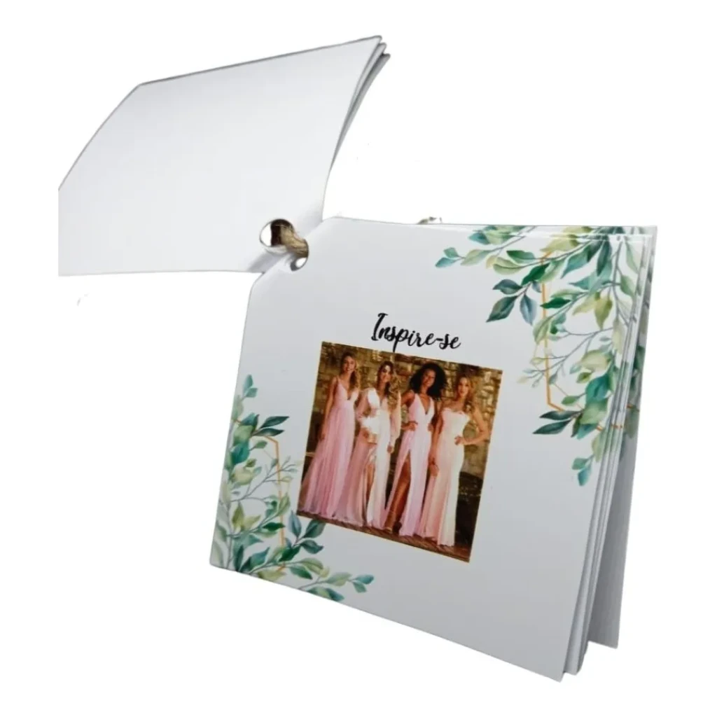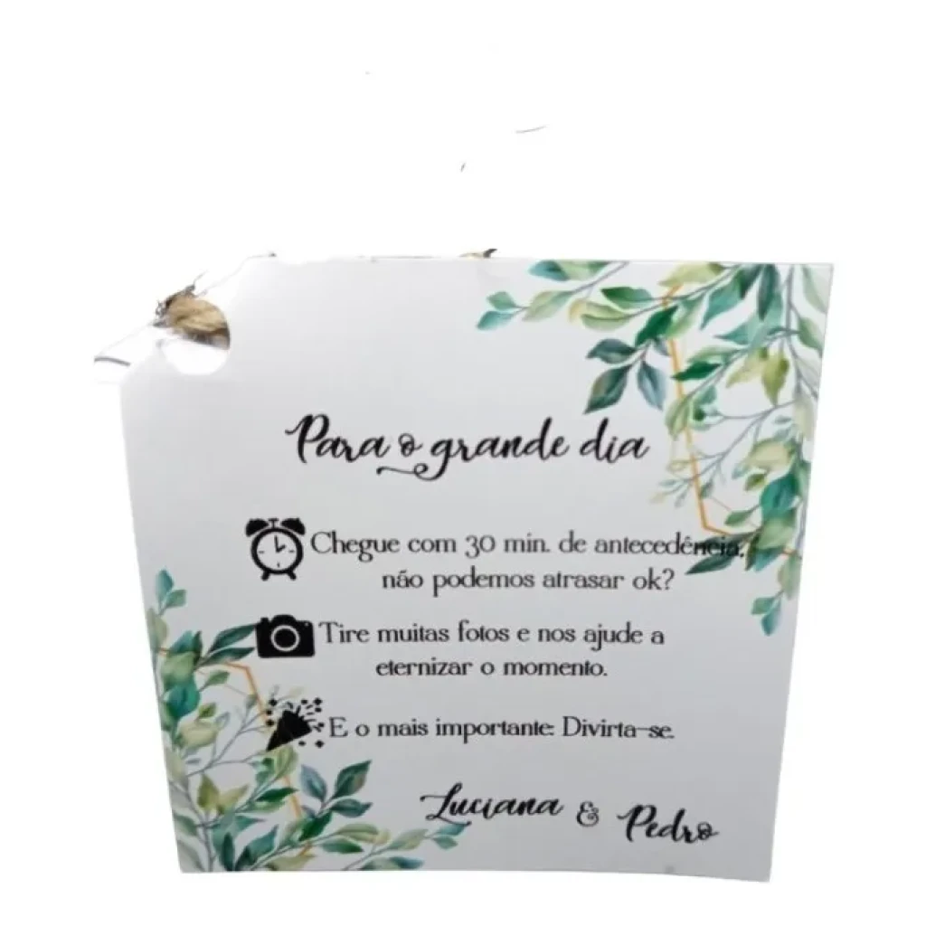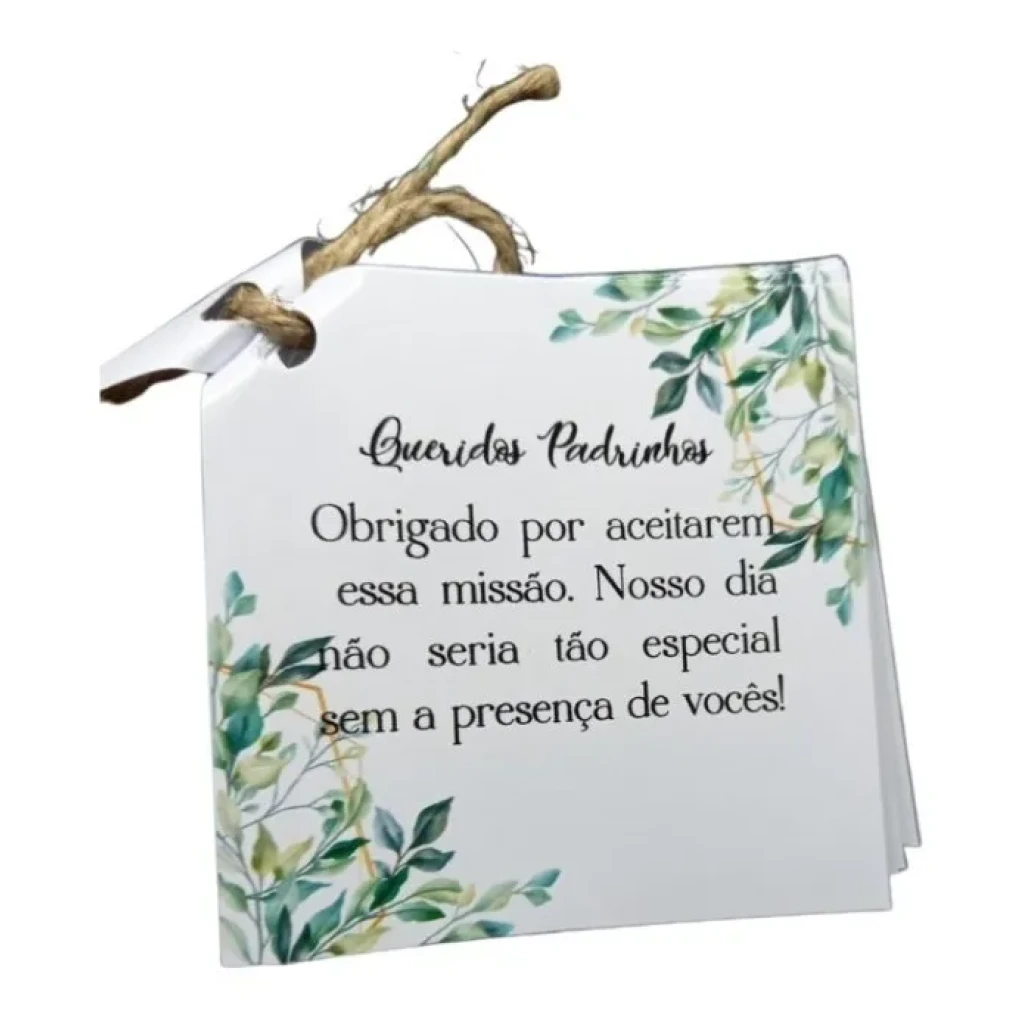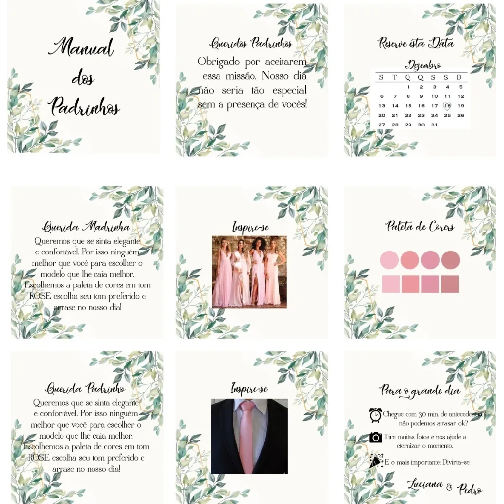 Ideal para surpreender seus padrinhos, o manual é finalizado com corte a laser e pode ser personalizado com cores e textos de sua escolha. Uma forma especial de mostrar sua gratidão!