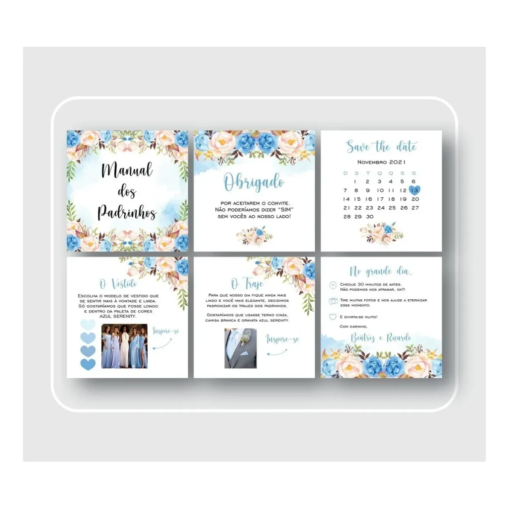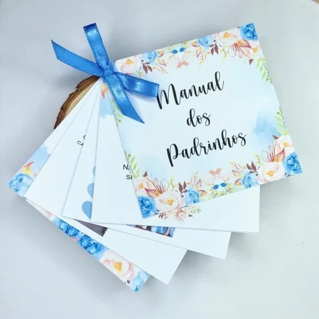 Os manuais dos padrinhos são impressos em papel branco resistente de 180g, com dimensões de 9,5×9,5 cm. Cada kit contém até 6 cartões, com a opção de personalização conforme sua preferência.