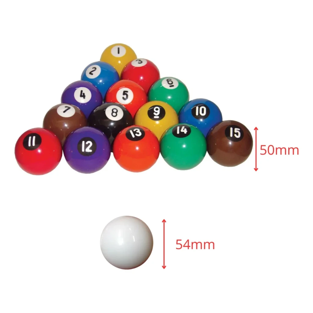 - 1 Jogo de bolas numeradas de 1 a 15 (50mm) e uma bola branca (54mm)