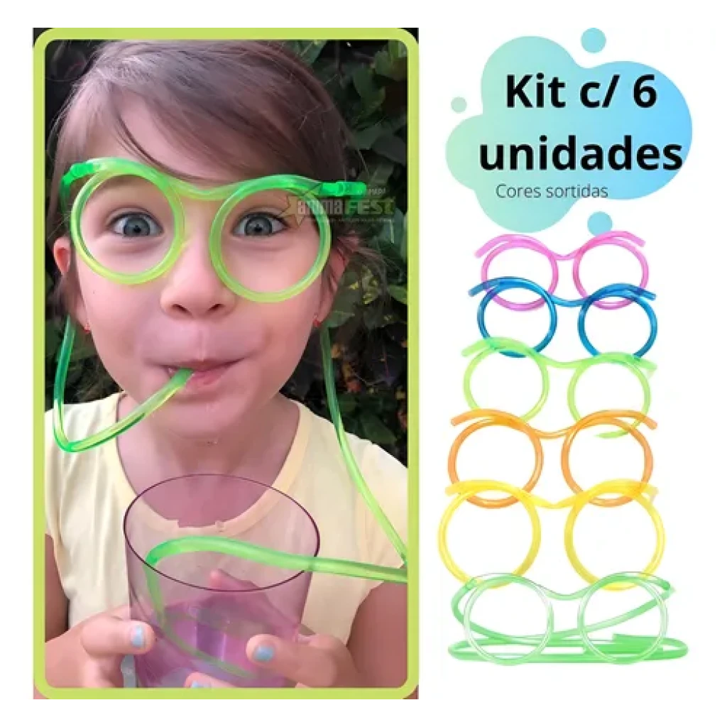 O Kit com 6 Óculos Canudo é a escolha perfeita para alegrar as festas das crianças. Feitos em plástico 100% lavável e reutilizável, esses óculos são desmontáveis, facilitando a higienização.