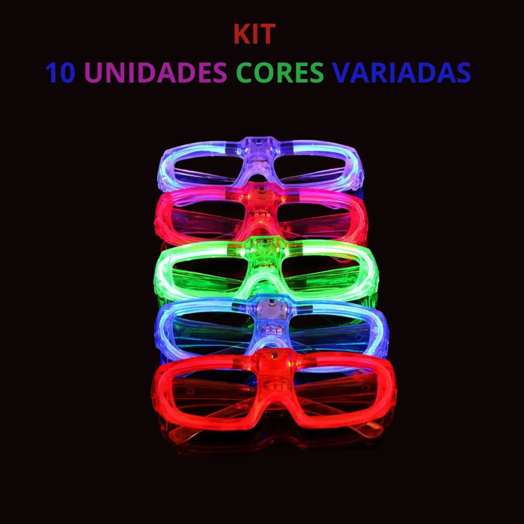 Ilumine sua festa com este pacote que contém 10 óculos de LED. Feitos com material acrílico durável, eles são a escolha perfeita para aniversários, baladas e eventos especiais.