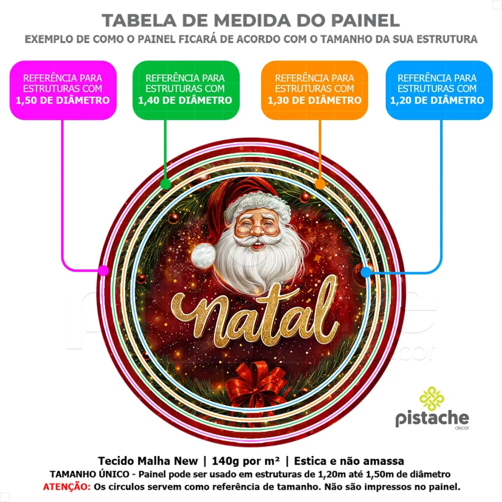 Este painel sublimado em tecido de 1,50m de diâmetro é a escolha ideal para quem deseja dar um toque festivo e alegre às comemorações de Natal. O sistema de instalação com elástico torna o uso prático e rápido.