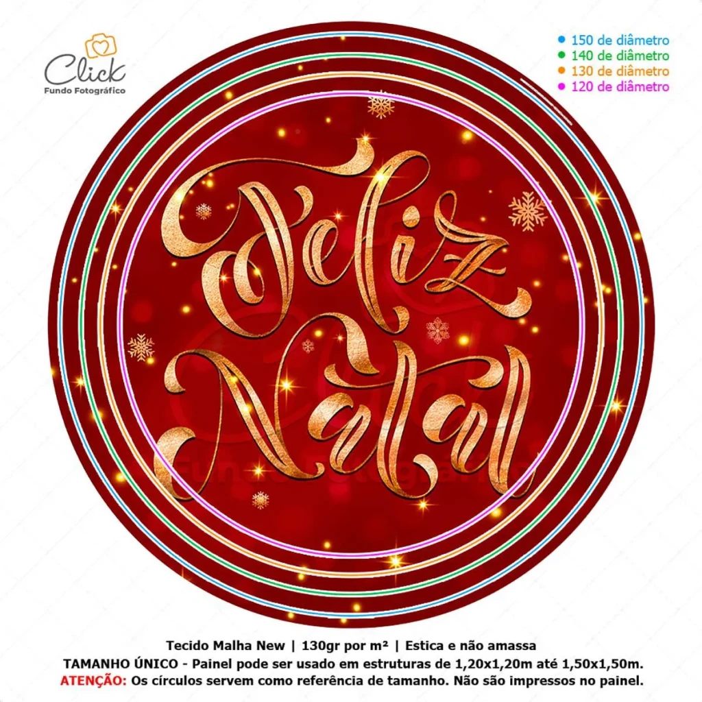 O Painel Redondo Sublimado em Tecido é a escolha perfeita para decorar sua festa de Natal. Com um diâmetro de 1,50m, ele é ideal para estruturas circulares e garante um acabamento de alta qualidade, com cores vibrantes e imagens nítidas.