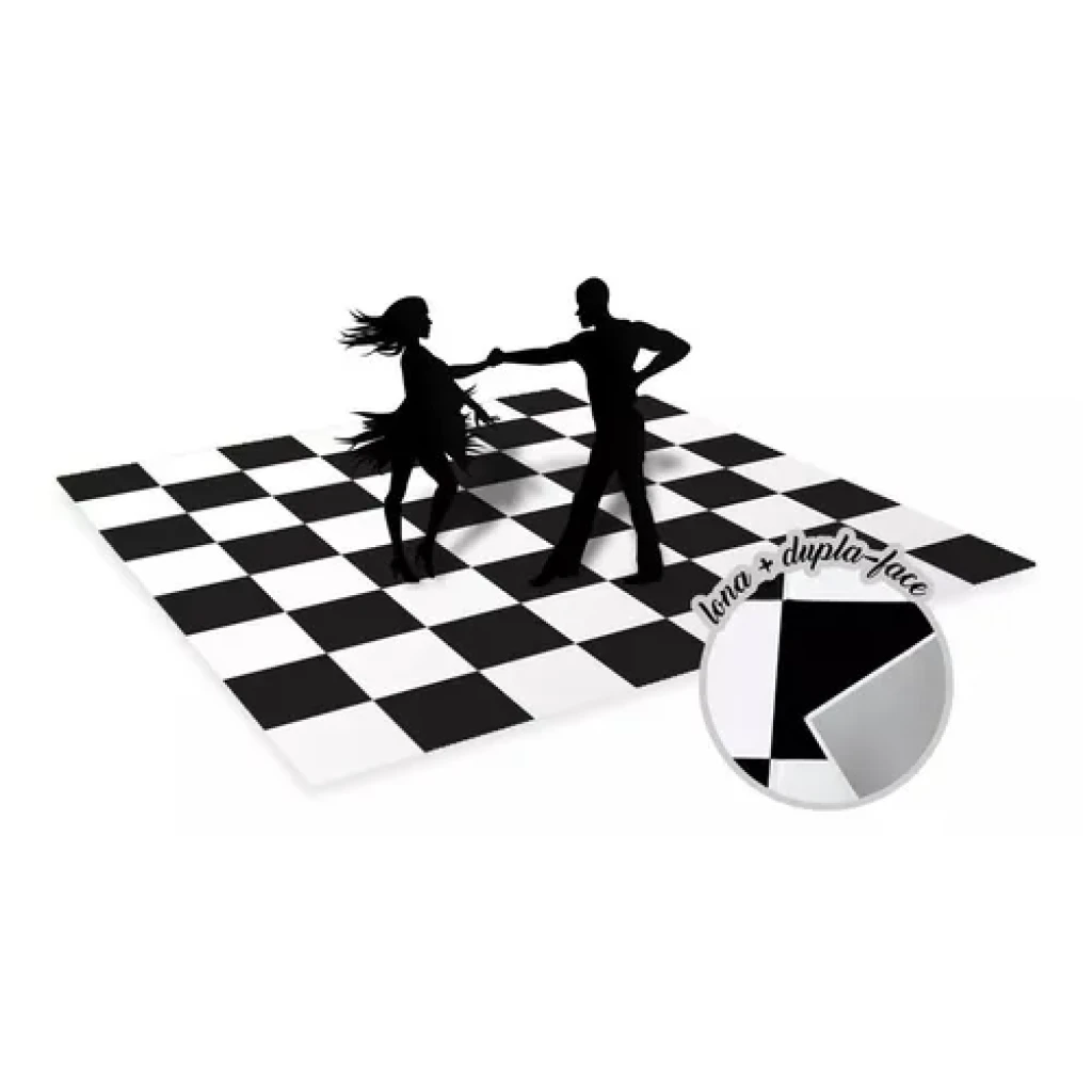 Transforme seu evento com uma pista de dança xadrez personalizada, impressa em altíssima resolução e pronta para instalação fácil e rápida.