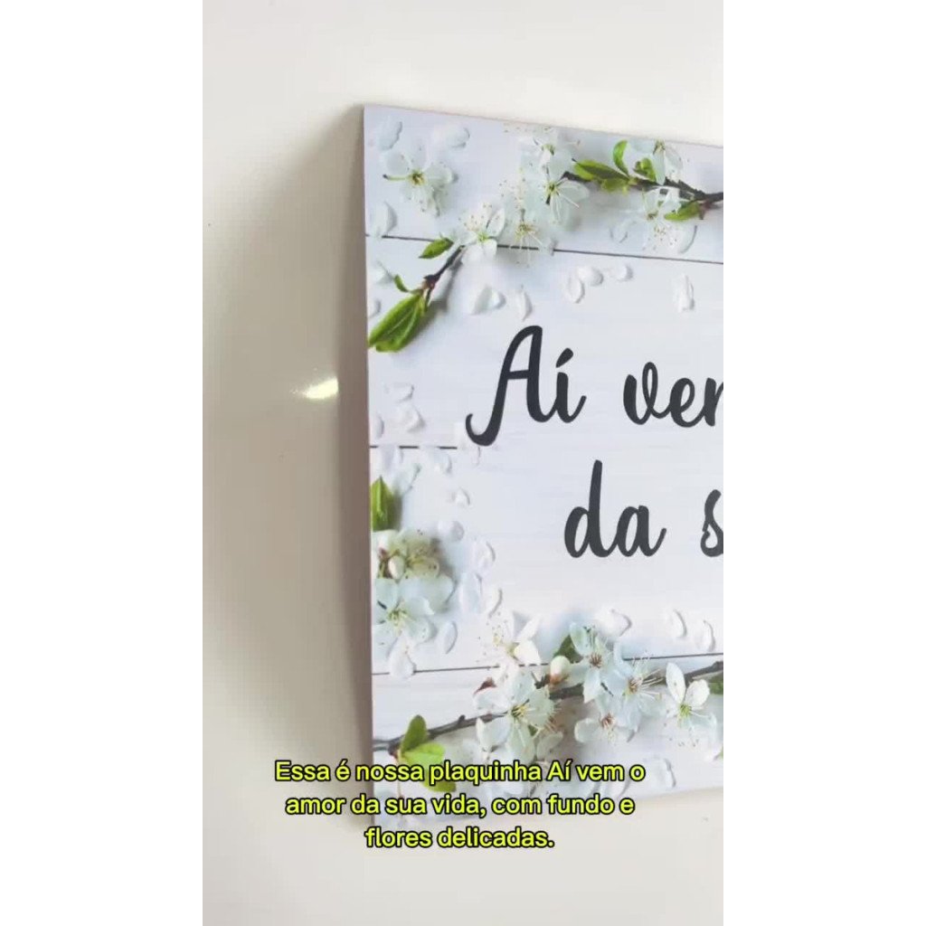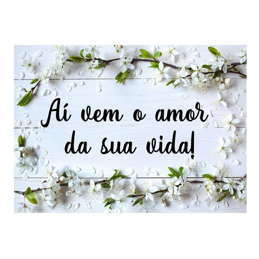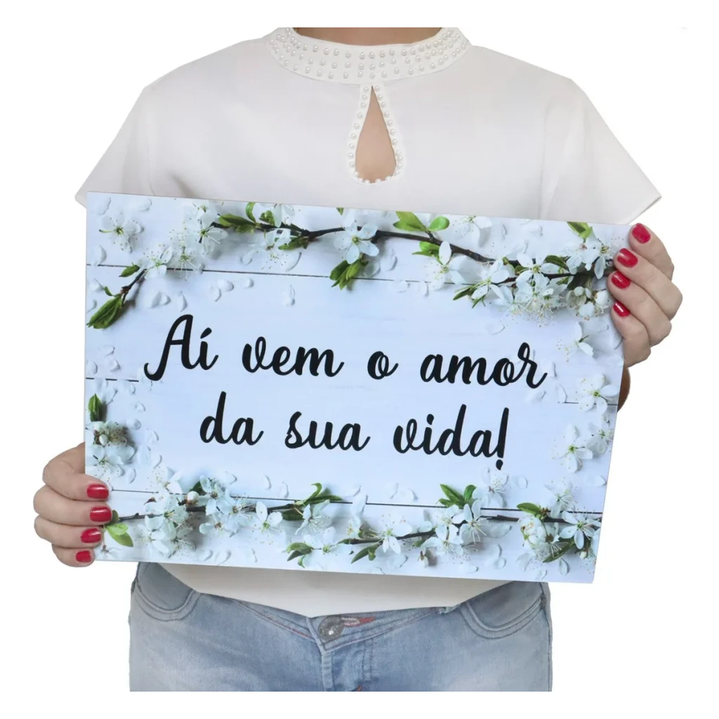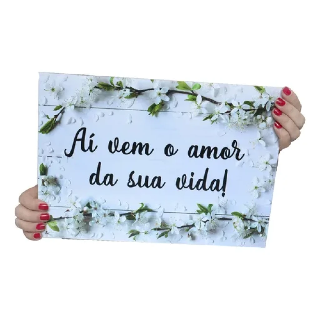 Adicione um toque especial à sua cerimônia de casamento com esta plaquinha encantadora. Com a frase “Aí vem o amor da sua vida”, ela promete emocionar os convidados.