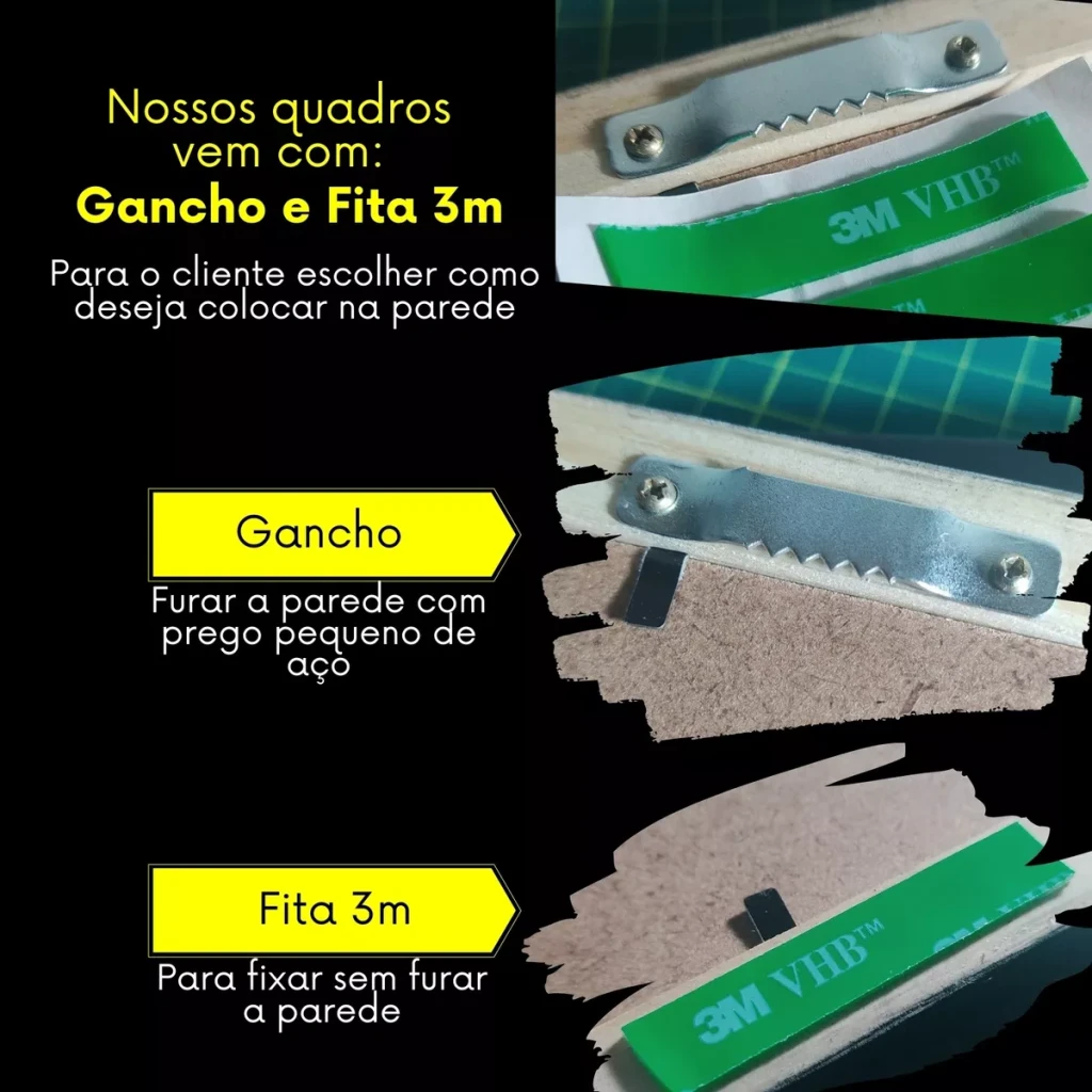 - Inclui gancho para fixação com um prego pequeno de aço.