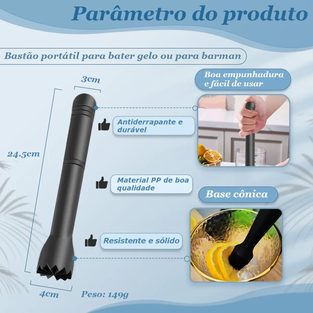 Com 25cm de comprimento, ele é resistente e ideal para amassar frutas e quebrar gelo.