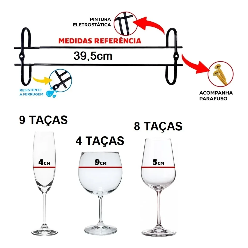 - Capacidade: Acomoda taças com base de até 10cm de diâmetro