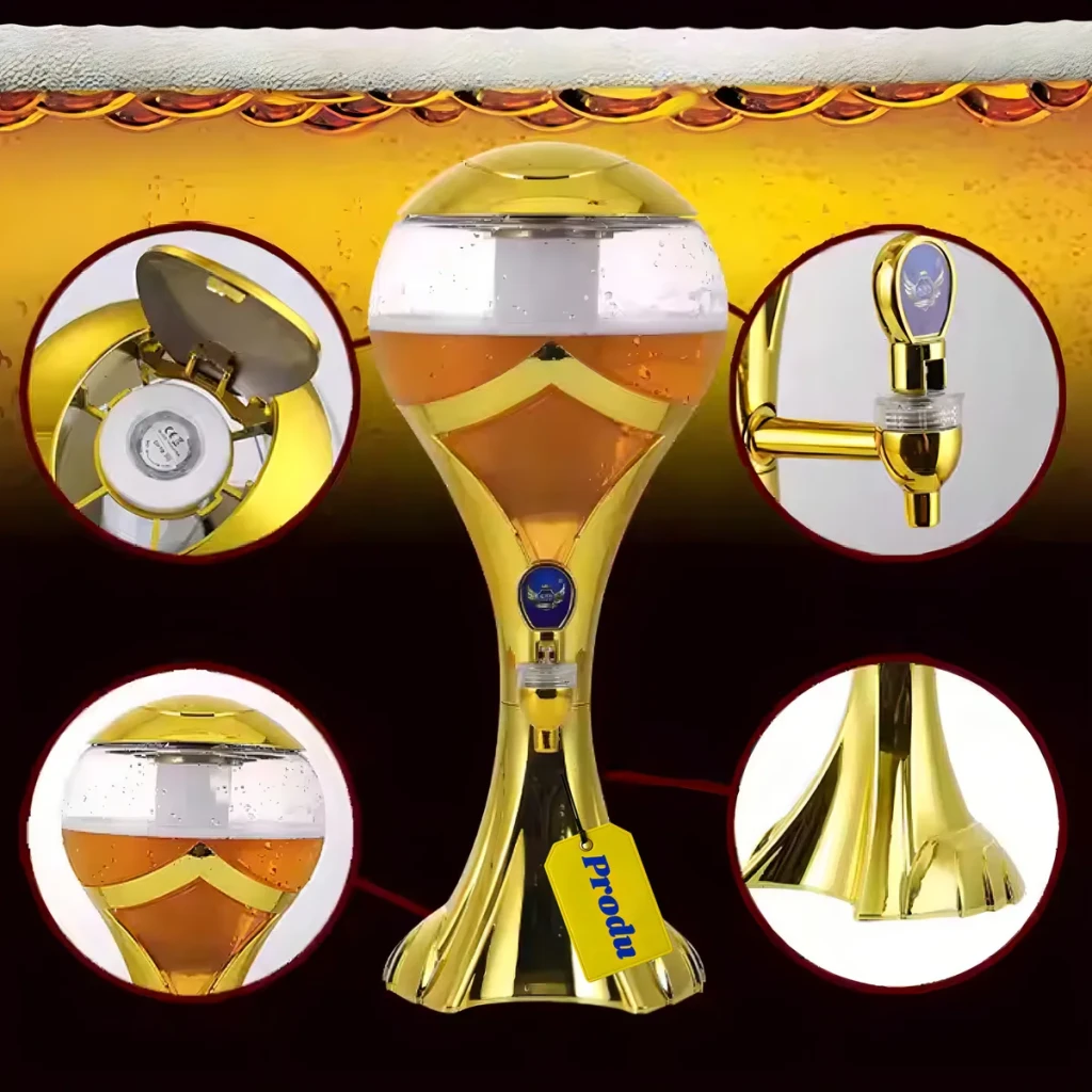 Desfrute de festas inesquecíveis com nossa Torre de Chopp Dourada, que tem capacidade para 3 litros e um sistema de refrigeração inovador com câmara de gelo.