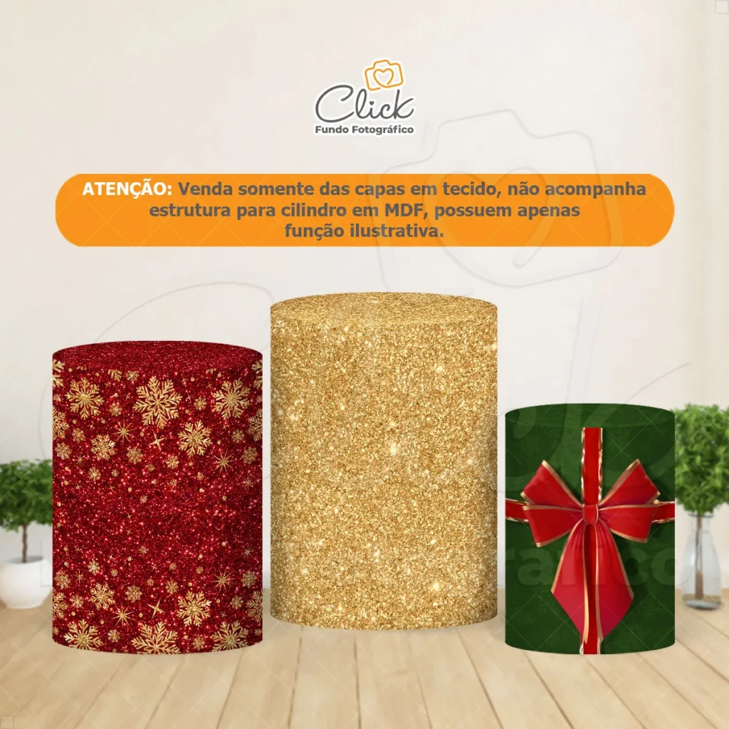 Transforme suas festas de Natal com o Trio de Capas de Cilindro em tecido sublimado. Feitas de malha de alta qualidade, essas capas são perfeitas para dar um toque especial à sua decoração.