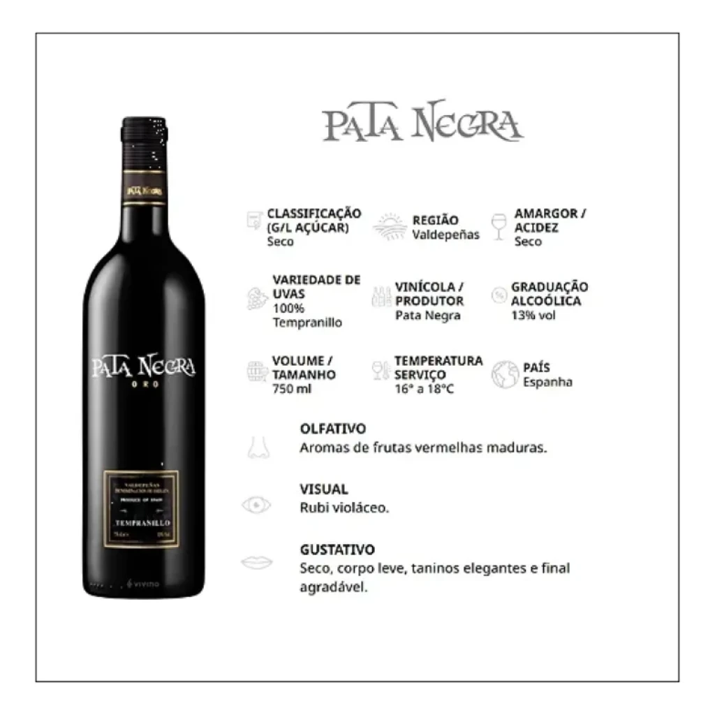 Descubra o Vinho Tinto Espanhol Oro Tempranillo da renomada Pata Negra, um rótulo que exala tradição e qualidade. Com 750ml, este vinho tinto seco é elaborado com uvas Tempranillo, envelhecido por 6 meses, e é perfeito para harmonizar com aves, carnes vermelhas e queijos curados.