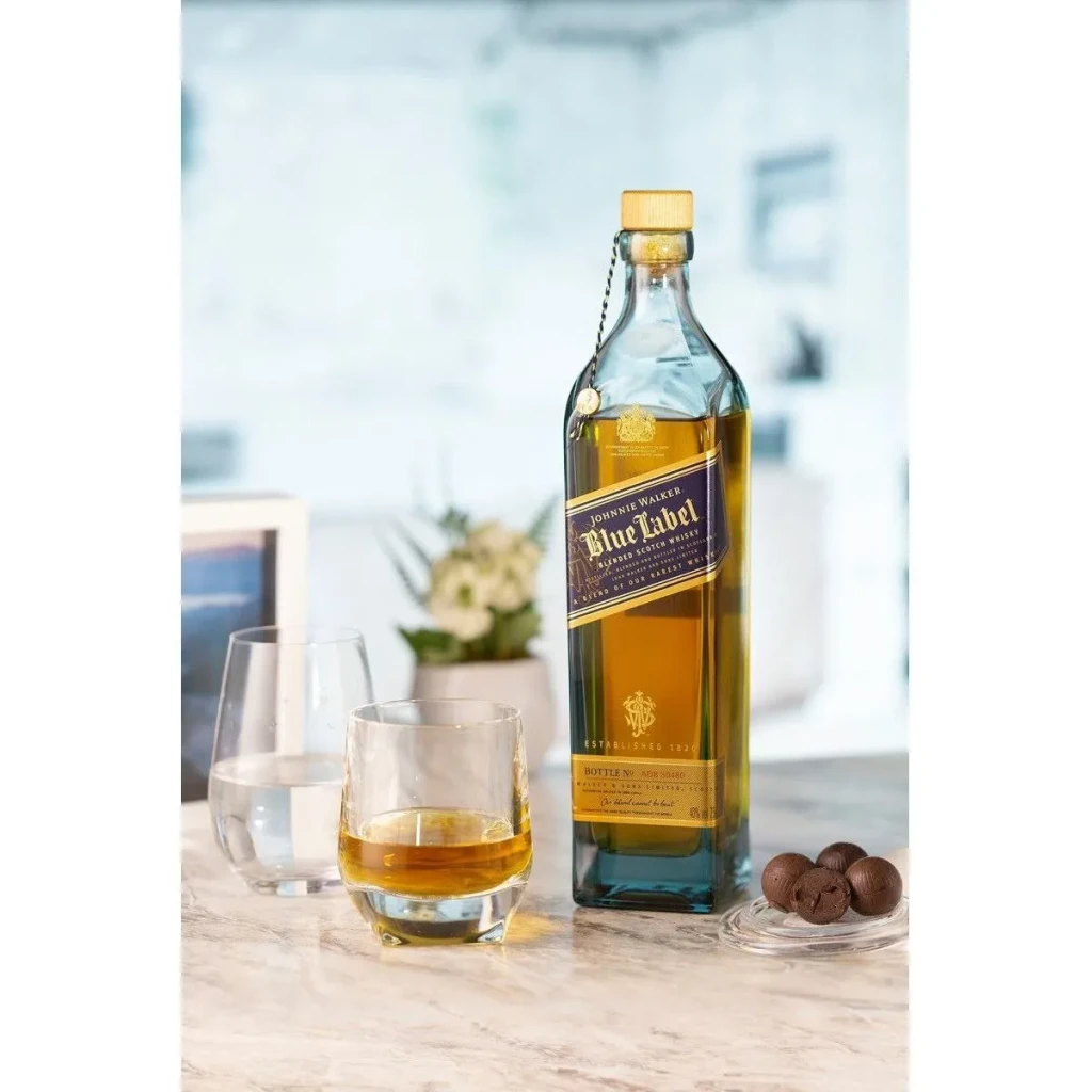 Apenas um em cada dez mil barris possui a riqueza e qualidade que fazem jus ao nome Blue Label, tornando-o uma escolha singular para aqueles que buscam o melhor.